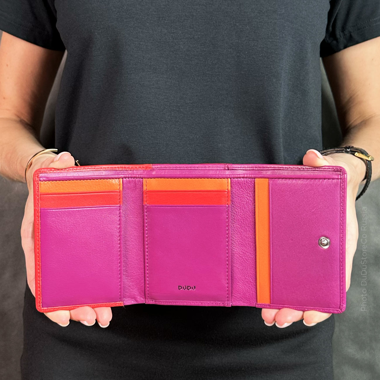 Итальянский цветной кожаный кошелек DuDu серии Corsica – это компактный и при этом вместительный женский кошелек на каждый день. Благодаря небольшому размеру и продуманной эргономике он легко помещается даже в небольшую женскую сумочку, оставаясь при этом действительно функциональным и удобным в использовании. Внутри кошелька найдётся место и для бумажных купюр, и для множества пластиковых карт. А удобный фермуар на защёлке сзади обеспечит быстрый доступ к монетам и картам. Этот кожаный кошелек станет вашим незаменимым спутником в повседневной жизни, а также в поездках и путешествиях.
